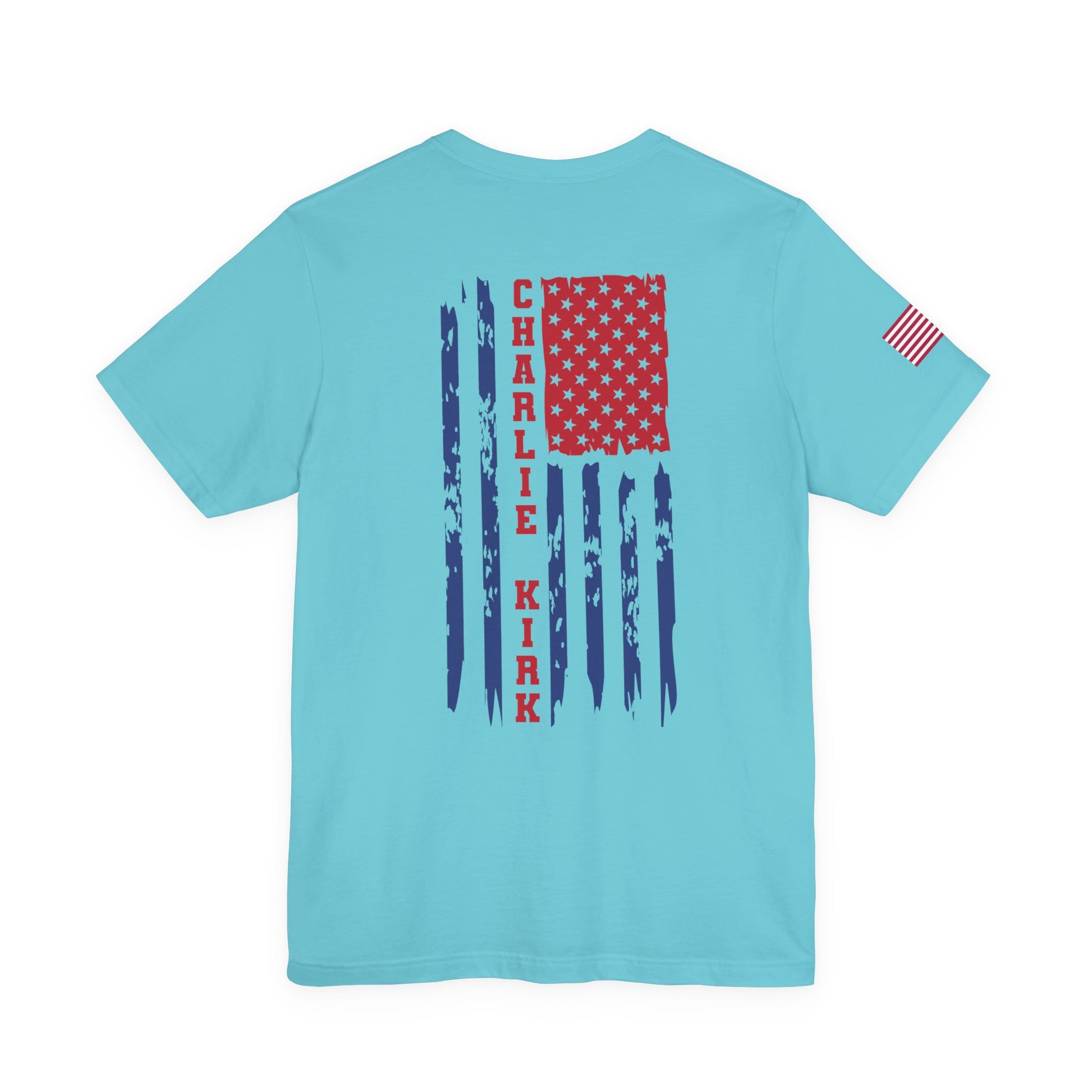 Celebrate freedom, conservative values, and support for Charlie Kirk with this premium unisex American Flag T-Shirt. Perfect for Turning Point USA supporters, patriots, and anyone who wants to showcase their love for the USA. Made from soft, breathable fabric, this shirt offers all-day comfort and a stylish fit for men and women alike.